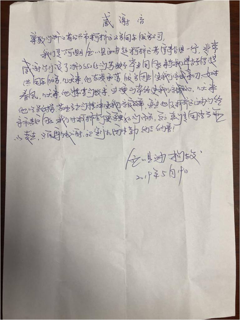 5月19日,區(qū)公車(chē)公司收到一封來(lái)自四川省阿壩州金川縣的感謝信。來(lái)信中,金川縣赴我區(qū)考察學(xué)習(xí)組一行由衷感謝了公司浙DS5265車(chē)的駕駛員李建國(guó)同志在履行出車(chē)任務(wù)期間待人和藹、愛(ài)崗敬業(yè),以精湛的駕駛技術(shù)和吃苦耐勞的工作態(tài)度,使考察組一行倍感親切、如沐春風(fēng),提高了考察組一行的辦事效率,對(duì)我區(qū)有了更深更好的認(rèn)識(shí),并送出無(wú)恙族祝福語(yǔ):納吉納魯。